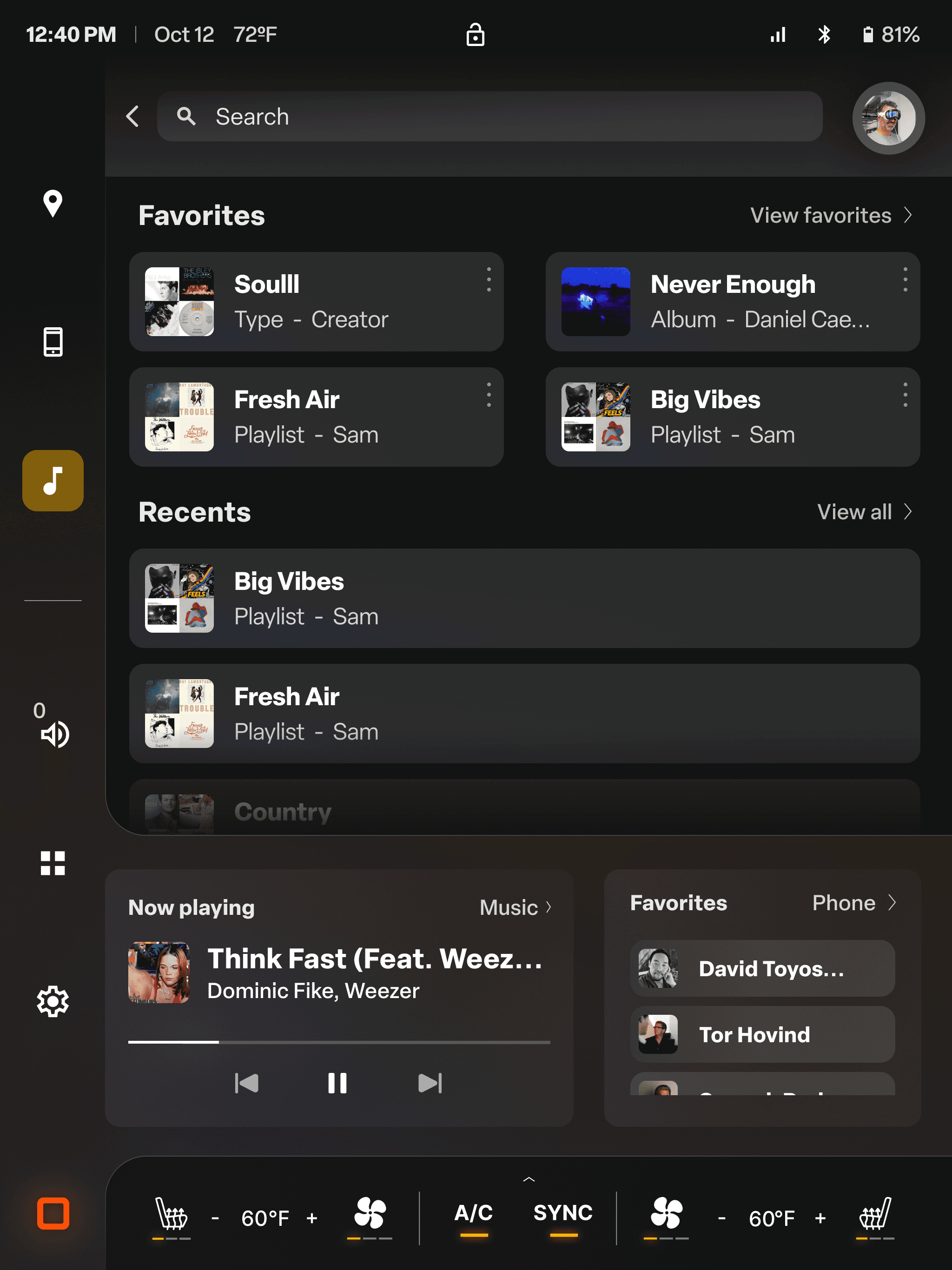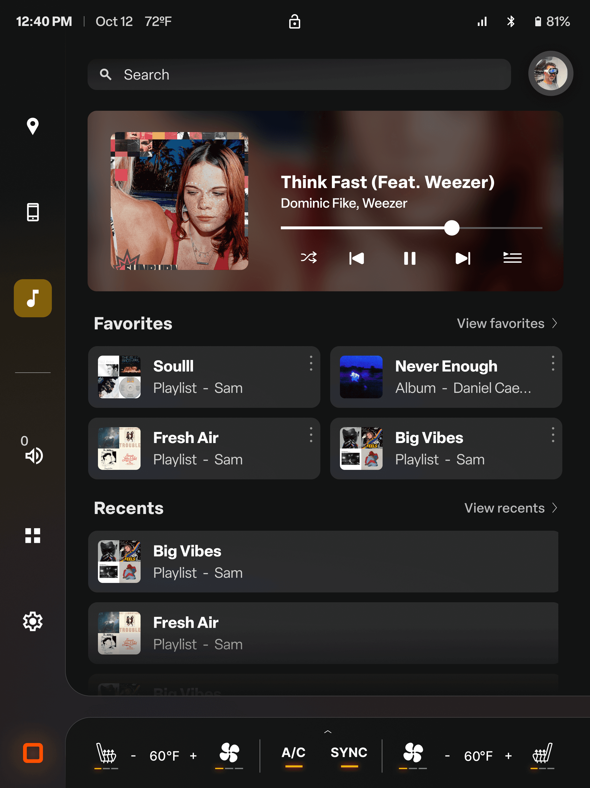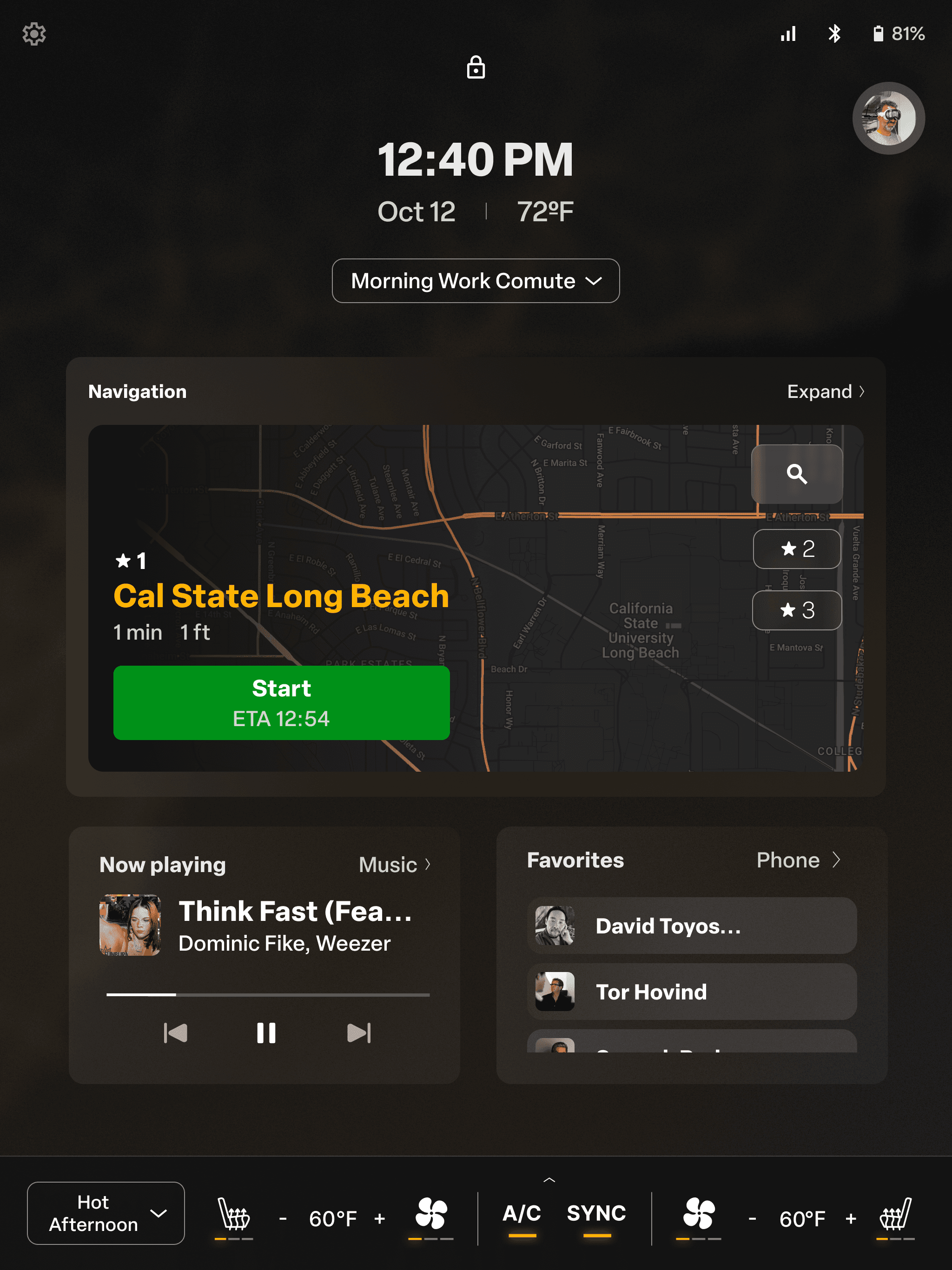 Quick actions/favorited features (navigation, music, etc.)
