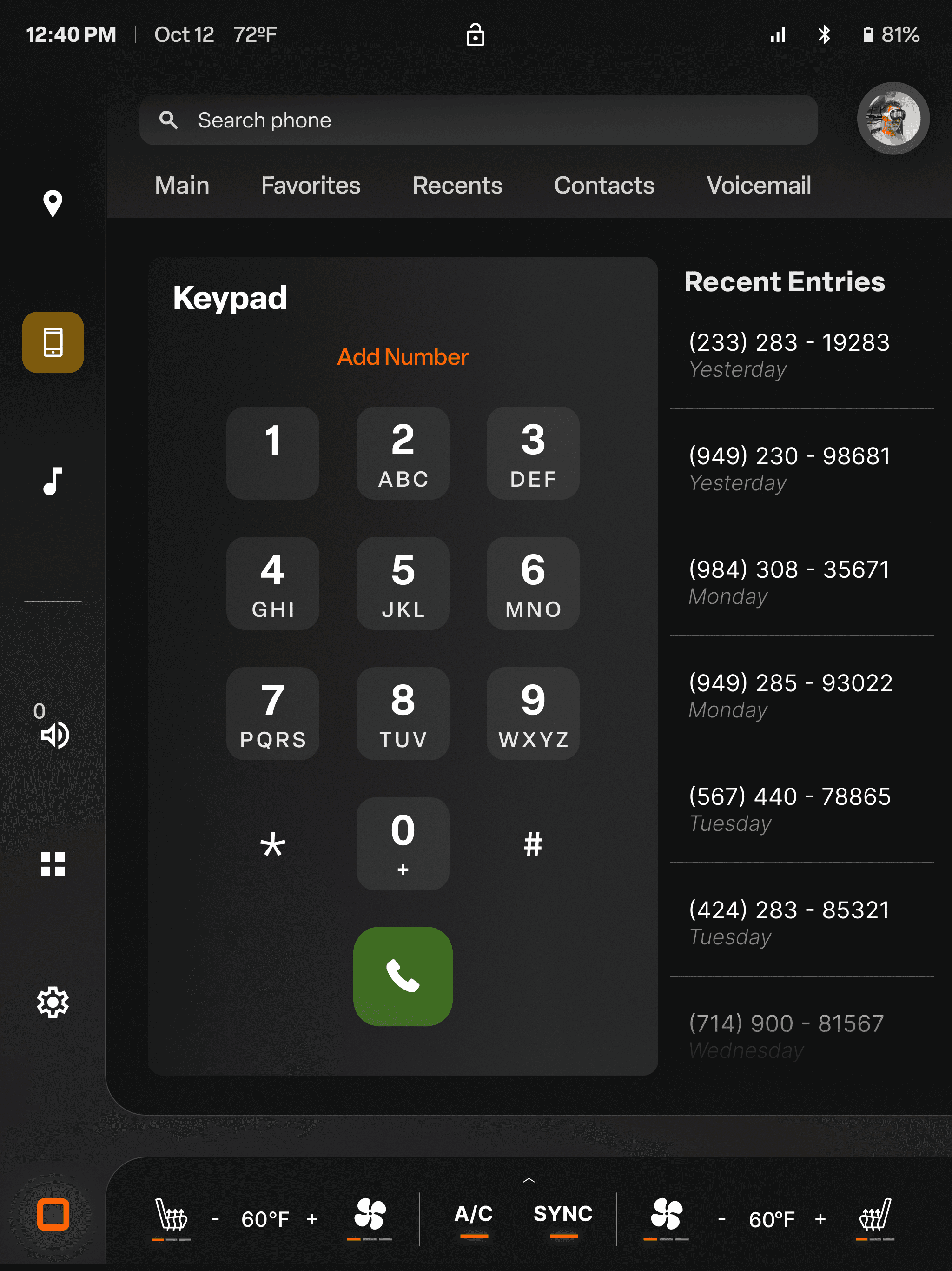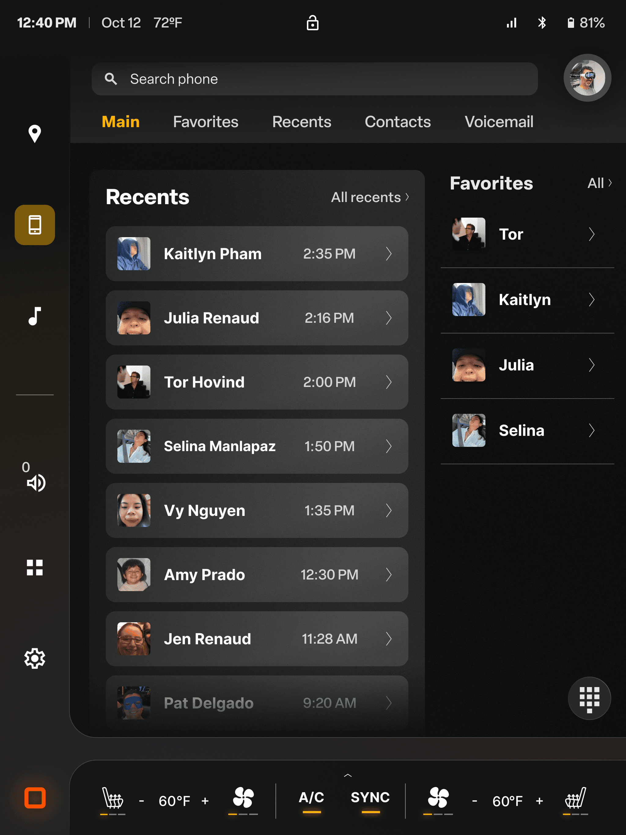 Designed for quick and safe calling on the road. Recents and favorites are displayed side by side for instant access, while the keypad function brings up a clear dial pad with recent entries for easy redialing.